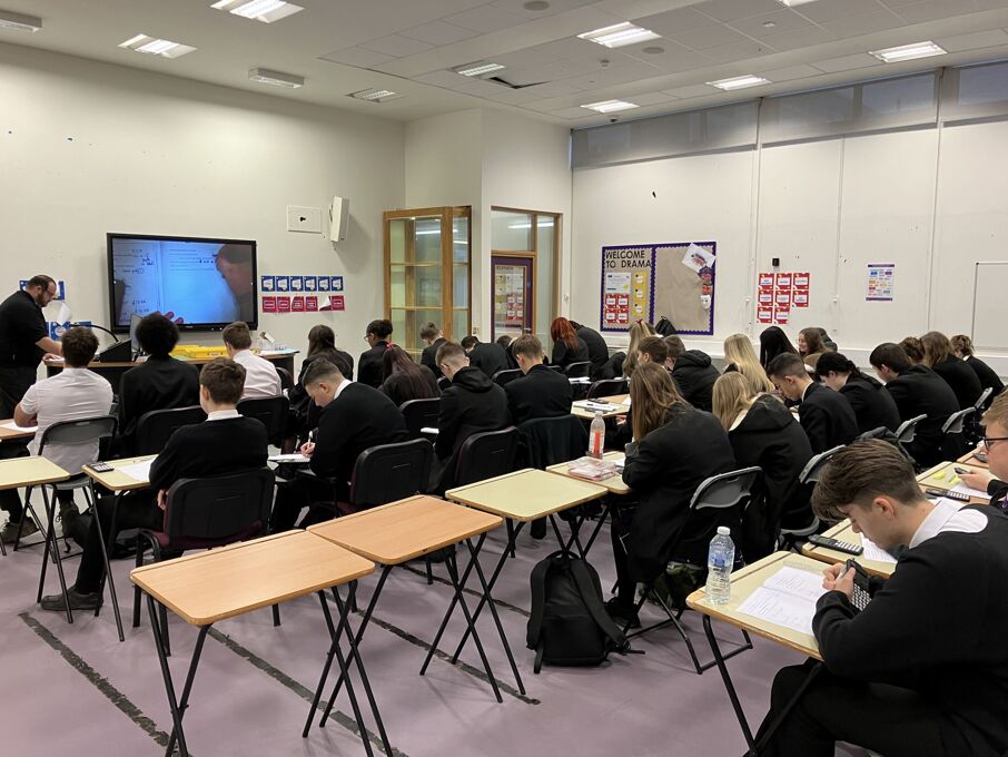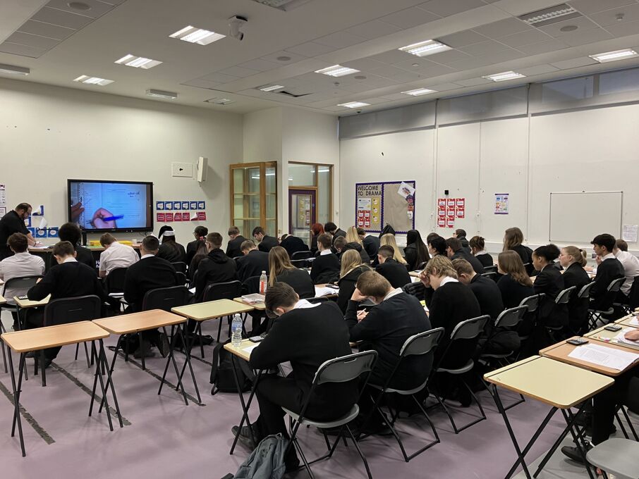 Year 11s completing a Walking Talking Mock with Mr Francis on Wednesday morning. Mr Francis completes the example question for the best exam modelled answer - students then attempt a mirror image of that question by themselves.